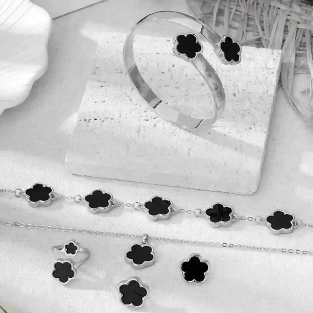 You get 1 necklace + 2 bracelets + 1 ring + 1 pair of earrings — all matching five-petal flower design. Complete coordinated look in one click.
