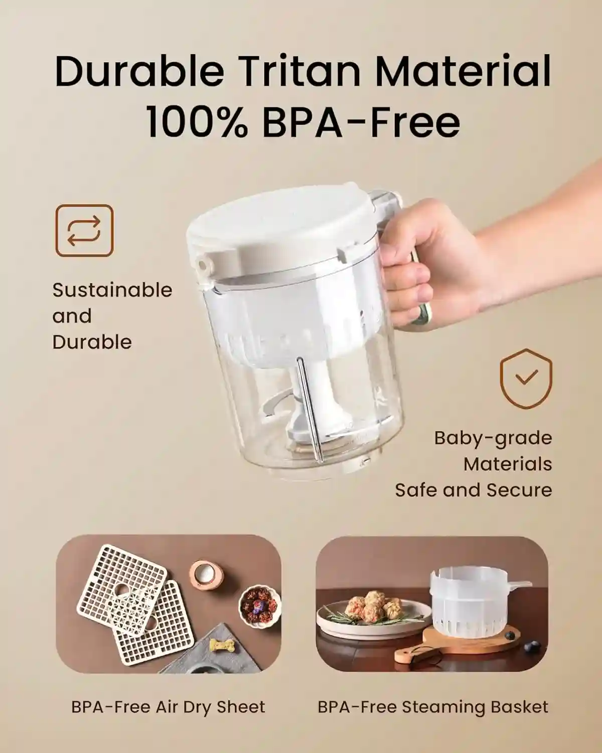 All food-contact parts use baby-grade Tritan blending cup + food-grade PP & PA. Zero BPA, zero phthalates, high-temperature resistant up to 248 °F.