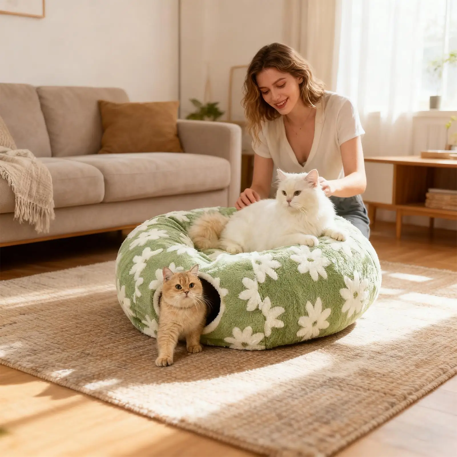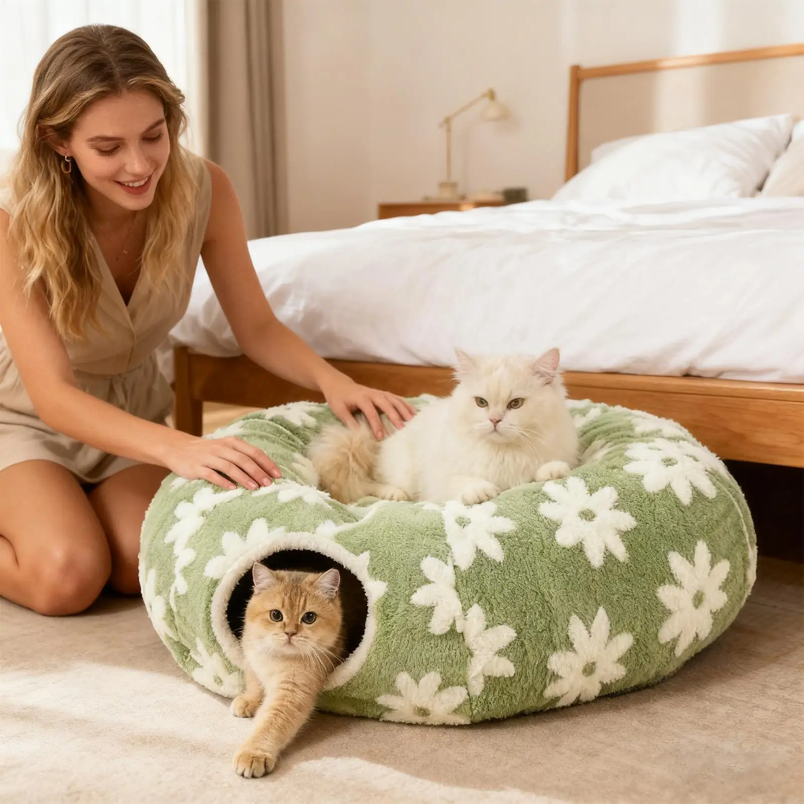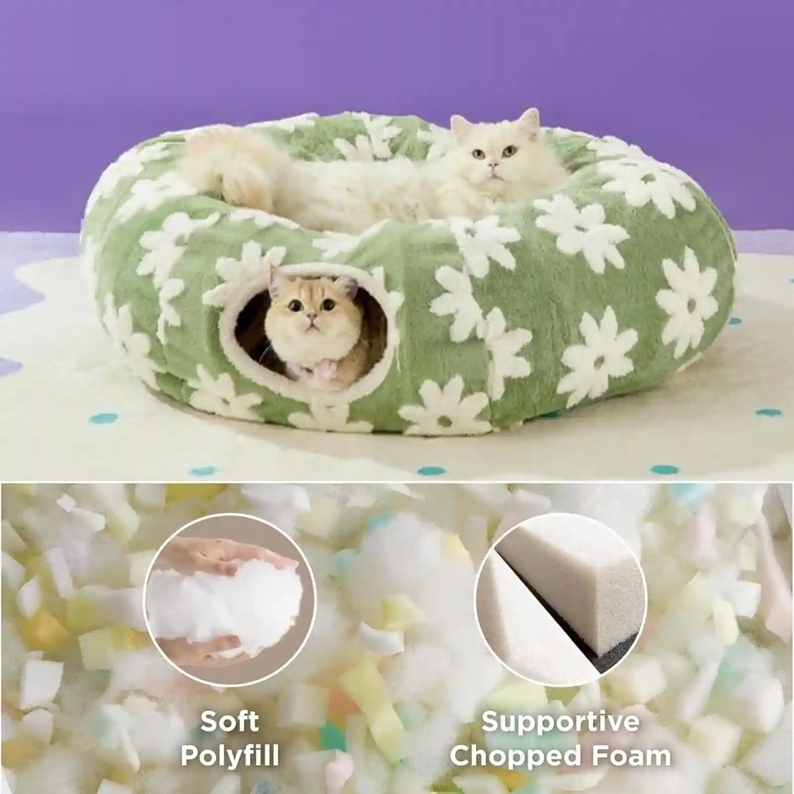 Every swirl of the donut echoes the shape of a warm hug. The dangling flower isn’t just a toy — it’s a promise that even on rainy days, curiosity wins. We made this tunnel so your cat always has a soft place to hunt dreams and a safe corner to rest them.
