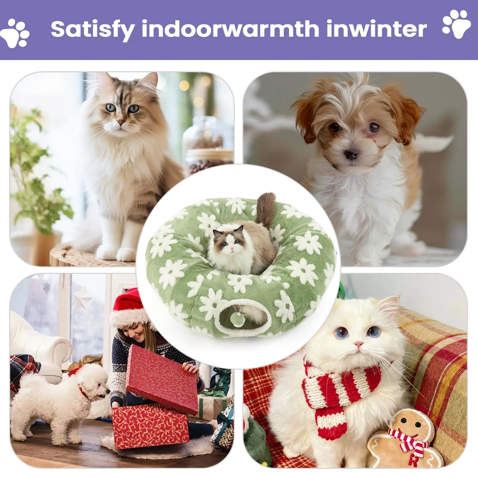 The cat donut tunnel serves as a 2-in-1 plush toy and bed, designed to provide entertainment for kittens, puppies, and even bunnies. This interactive playground features tubes that create a snug, cave-like space, perfect for crawling and teething. The inclusion of a ball adds an extra layer of engagement, making it ideal for indoor and outside use. Crafted with soft plush material, the donut tunnel provides a comfortable house for pets to relax, while doubling as a fun play area. Whether placed indoors or outdoors, this product ensures your pet enjoys endless hours of safe and enjoyable activity. Its versatile design makes it suitable for various small animals, enhancing their daily playtime experience.