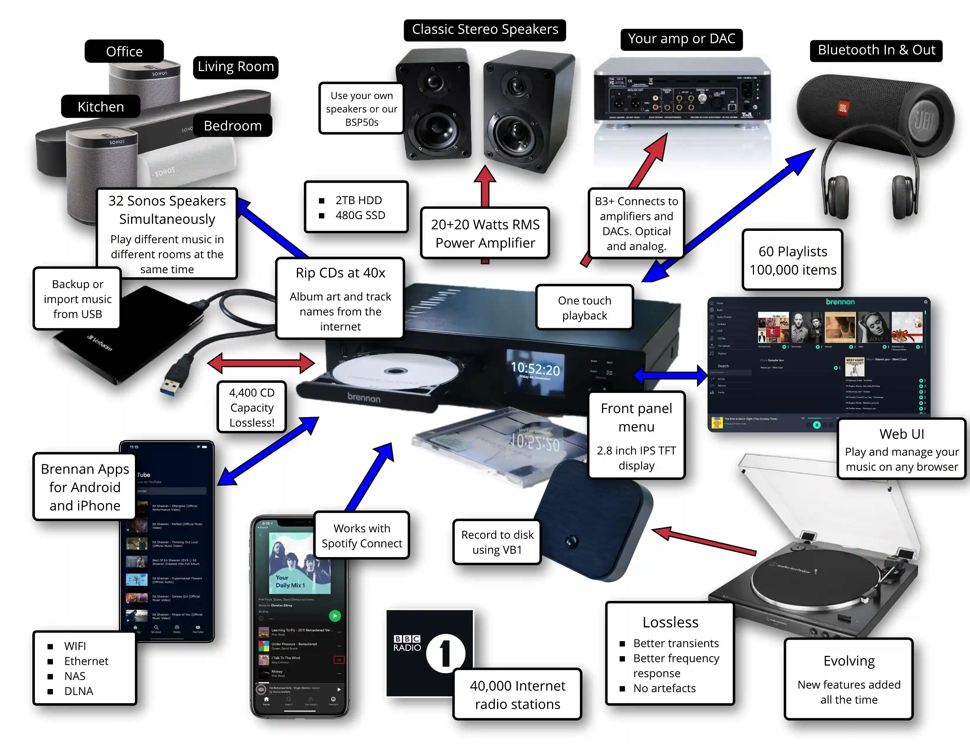 B3 includes web interface, Internet Radio, Bluetooth. 20+20W amplifier. Play through Sonos speakers and control with the Brennan App.